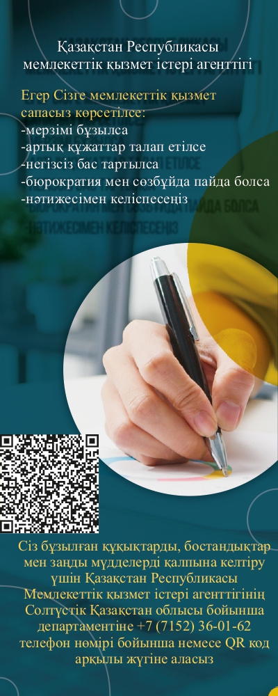 Мемлекеттік қызметтерді көрсету сапасын бақылау сапа қызметі іске асырады, келесі телефон бойынша жүгіну:+7-7152-50-47-72.