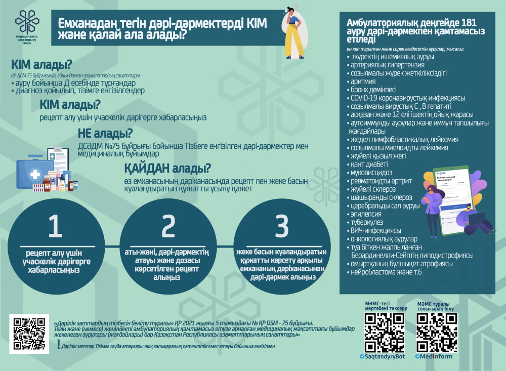 Қазақстан тұрғындары тегін дәрі-дәрмек алуға құқылы. Тегін дәрі-дәрмекті белгілі ауруы бар, яғни медициналық көрсеткіштері бар адамдар ғана ала алады. Тегін дәрі-дәрмектер тізімі ҚР Денсуалық сақтау Министірлігінің 2021 жылдың 5 тамызындағы №75 Бұйрығында көрсетілген (https://adilet.zan.kz/rus/docs/V2100023885).