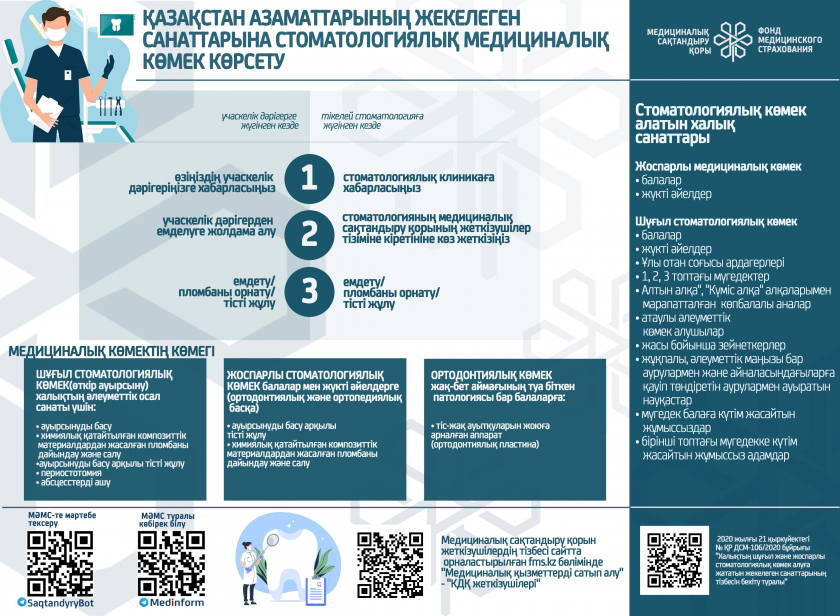Айта кетейік, 1 ақпандағы жағдай бойынша МӘМС шеңберінде стоматологиялық көмек көрсететін 838 медициналық ұйыммен шарттар жасалды. Оның ішінде 519-ы – жекеменшік, 319-ы – мемлекеттік меншік нысаны, яғни емханалар мен ауруханалар.
